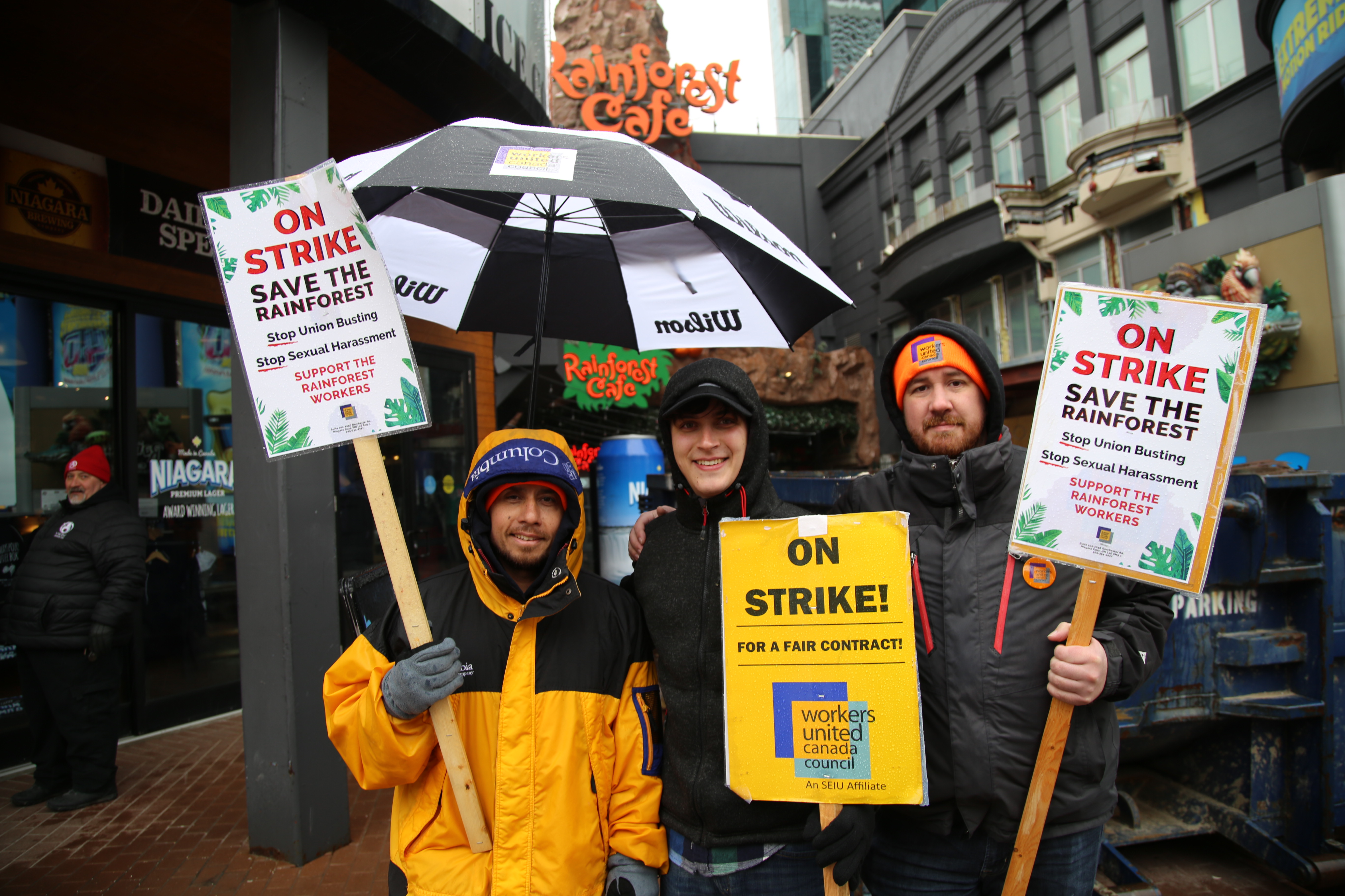 In March 2018, workers at the Rainforest Café in Niagara, Ontario, Canada voted overwhelmingly to unionize. The 77-person bargaining unit chose Workers United as their exclusive bargaining representative by a vote of 44 to 7. Almost a year later, the workers still lack a contract with the owners of the Niagara Rainforest Café, Canadian Niagara Hotels. They have been on strike since April 6th fighting against wage theft, union-busting, and sexual harassment.