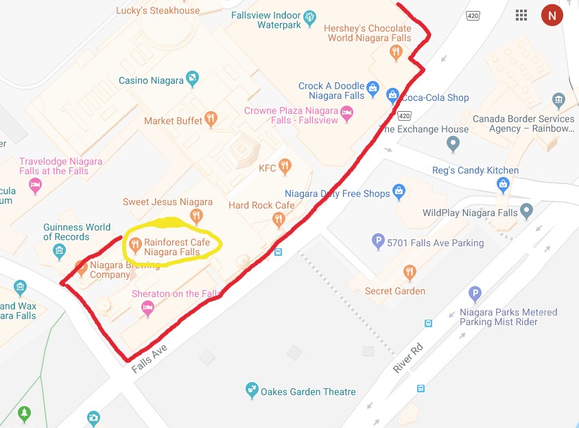 Canadian Niagara Hotels also owns the Niagara Brewing Company location to Rainforest Café’s left and property extending all around the block, including Sheraton Hotel, Crown Plaza Hotel, Casino Niagara, Hard Rock Café, an indoor waterpark, and Hershey’s. The map is detailed below: