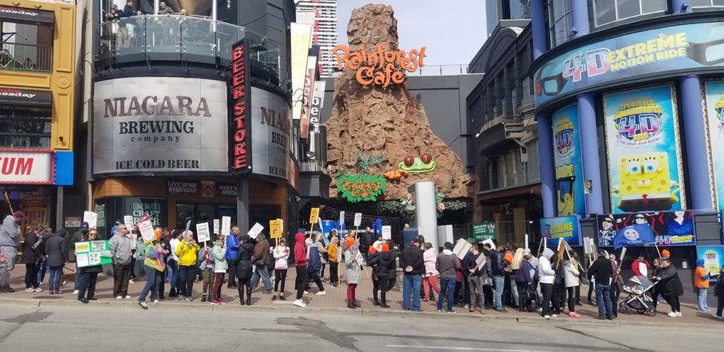 Canadian Niagara Hotels owns multiple restaurants in Niagara Falls on the same block. To truly damage the owner’s income stream from their behavior during the strike, the union would have to launch a boycott of all its businesses. One advantage Rainforest Café strikers held was sheer numbers in their bargaining unit and via activists from the United States and Canada. When I visited the Rainforest Café picket line, it was a cold, wet, windy day. Even though we were all drenched and freezing, ten strikers still showed up. They routinely turn out 30-plus to their Saturday rallies. With enough strikers to surround the property, the workers are actually equipped to damage profits. The restaurant has been almost completely empty on some weekend rush times, and organizers estimate Rainforest Café had lost over $1.5 million by week 4 of the strike.